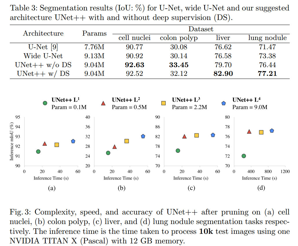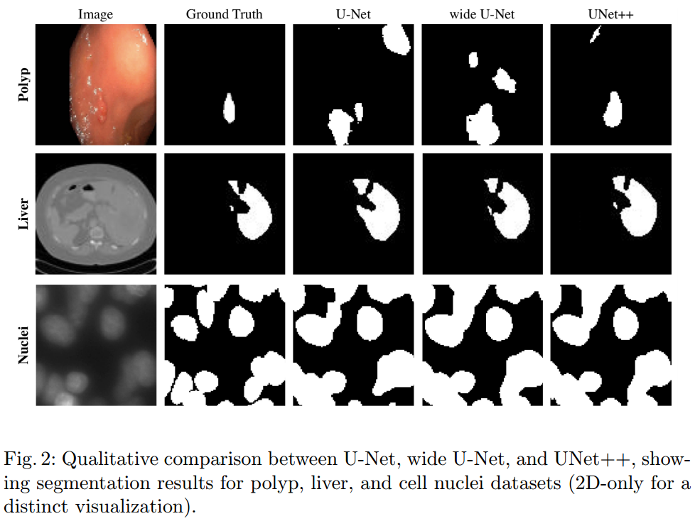 3. 将U-Net++与U-Net和宽U-Net架构在胸部低剂量CT扫描中的结节分割,显微镜图像中的细胞核分割,腹部CT扫描中的肝脏分割,结肠镜视频中的息肉分割等数据集上进行了对比评估。