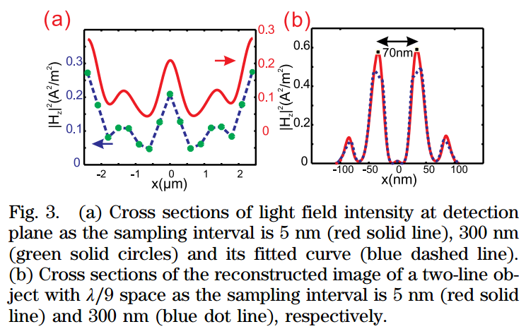 1. 图3(a)采样间隔为5 nm(红色实线)、300 nm(绿色实圆)时检测平面光场强度截面及其拟合曲线(蓝色虚线)。