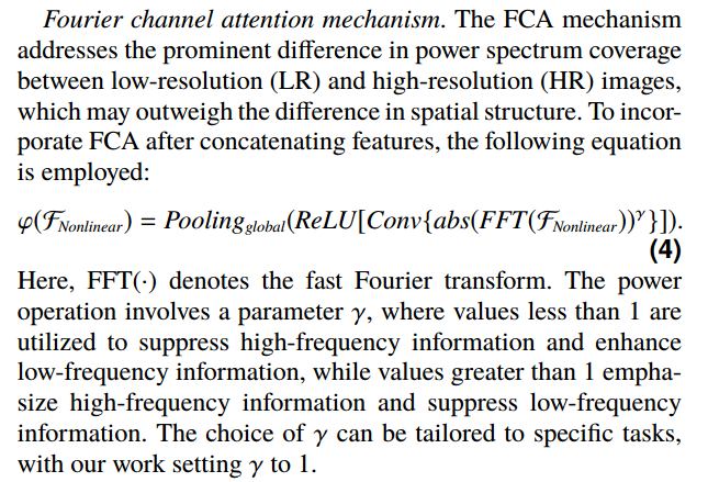 - FCA机制解决了低分辨率(LR)和高分辨率(HR)图像在功率谱覆盖上的显著差异,这种差异可能超过了空间结构的差异。为了在连接特征后纳入FCA。