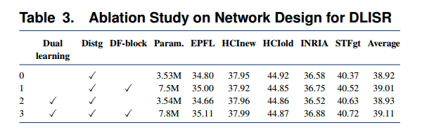 - 我们还通过选择性地从网络中移除DLISN中的双模块和FCA机制来证明DLISN的有效性。我们引入了一个不使用双重学习的网络(即模型1)和一个不使用df块的网络(即模型2)。表3显示了比较的PSNR结果。