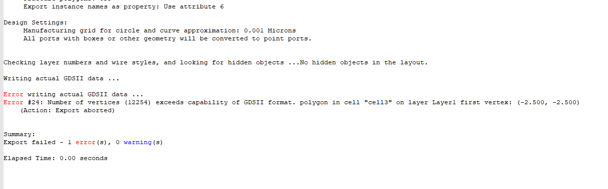 GDSII格式对于多边形的顶点数有一个上限,而在你的设计中,某个多边形的顶点数量超出了GDSII的处理能力: