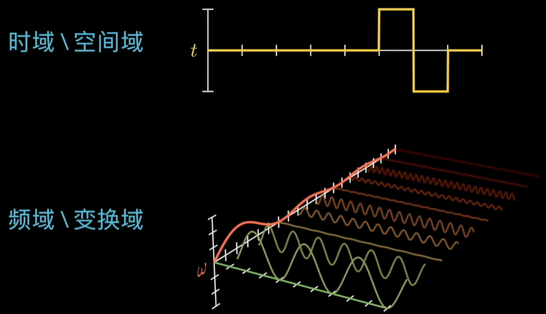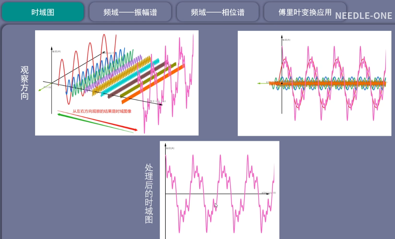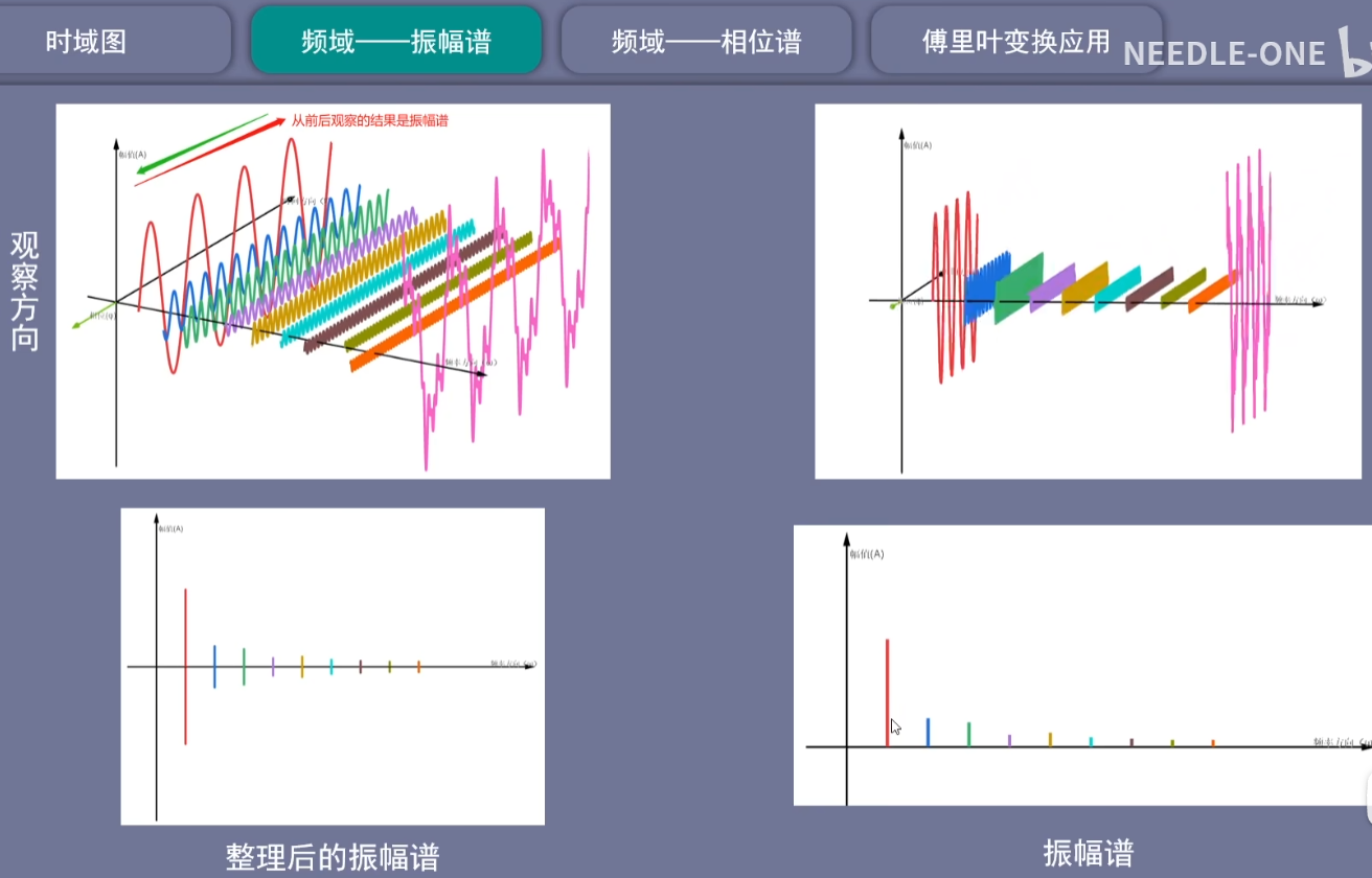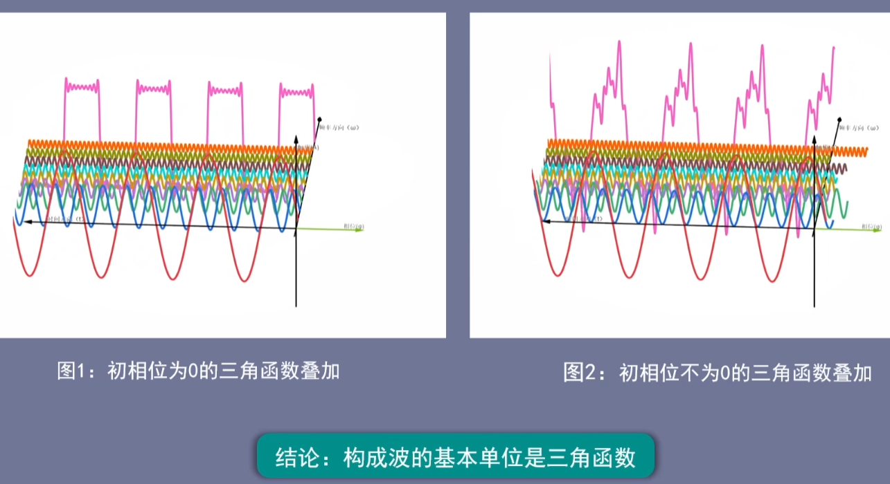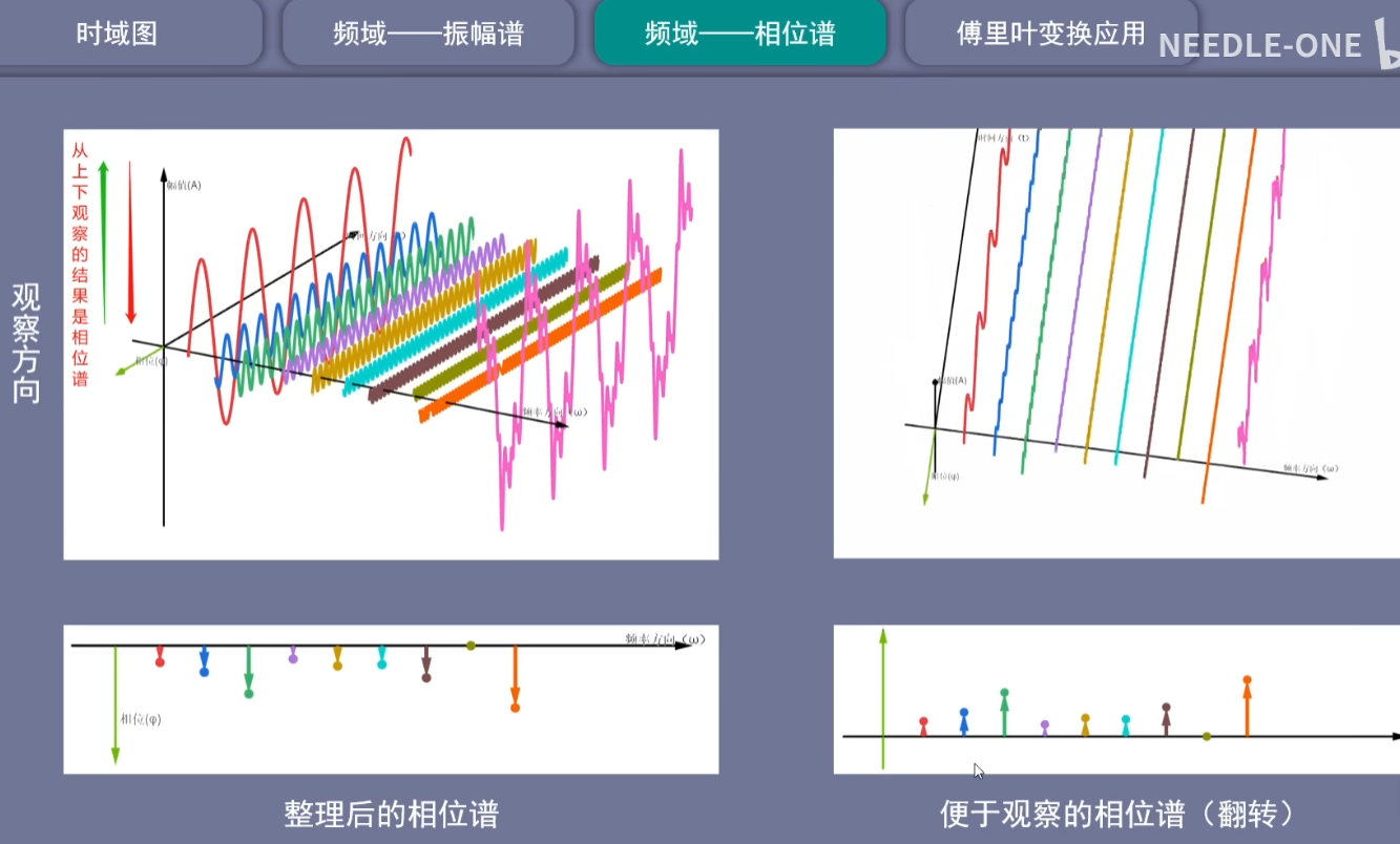 - 鉴于正弦波是周期的,我们需要设定一个用来标记正弦波位置的东西。在图中就是那些小红点。小红点是距离频率轴最近的波峰,而这个波峰所处的位置离频率轴有多远呢?为了看的更清楚,我们将红色的点投影到下平面,投影点我们用粉色点来表示。当然,这些粉色的点只标注了波峰距离频率轴的距离,并不是相位。