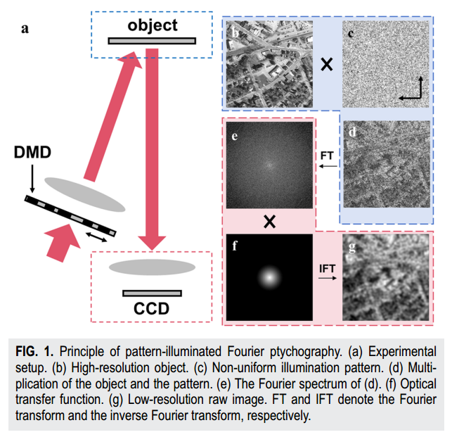 - 图样照明傅立叶平面照相术原理。(a)实验设置。(b)高分辨率物体。(c)光照模式不均匀。(d)物体和图案的乘法。(e) (d)的傅里叶谱。(f)光学传递函数。(g)低分辨率原始图像。FT和IFT分别表示傅里叶变换和傅里叶反变换。