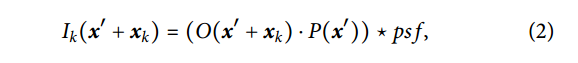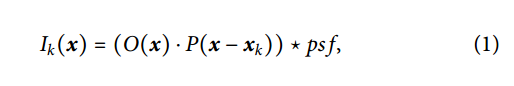 - 图1(b) -1 (g)总结了正向过程,式中,x为空间坐标,xk为图像的偏移量,O(x)为物体,P(x−xk)为第k个光照模式,psf为集体光学确定的强度点扩散函数,“⋅”为逐元乘法。⋆是卷积算子,Eq.(1)中的卷积运算通常通过快速傅里叶变换在傅里叶域中计算。