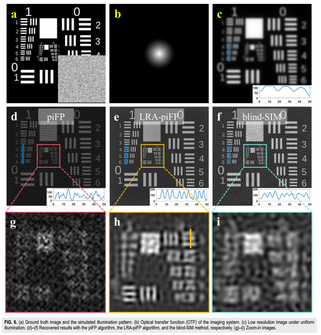 - 第二节描述了piFP的前向模型和我们用于恢复具有不同模式的高质量超分辨率图像的LRA-piFP算法;第三节给出了LRA-piFP方法的仿真结果;第四节通过在远程成像中使用USAF靶标和在光学显微镜中使用Siemens星靶来量化图像质量的改善,并将LRA-piFP与原始piFP以及blind-SIM的性能进行比较。