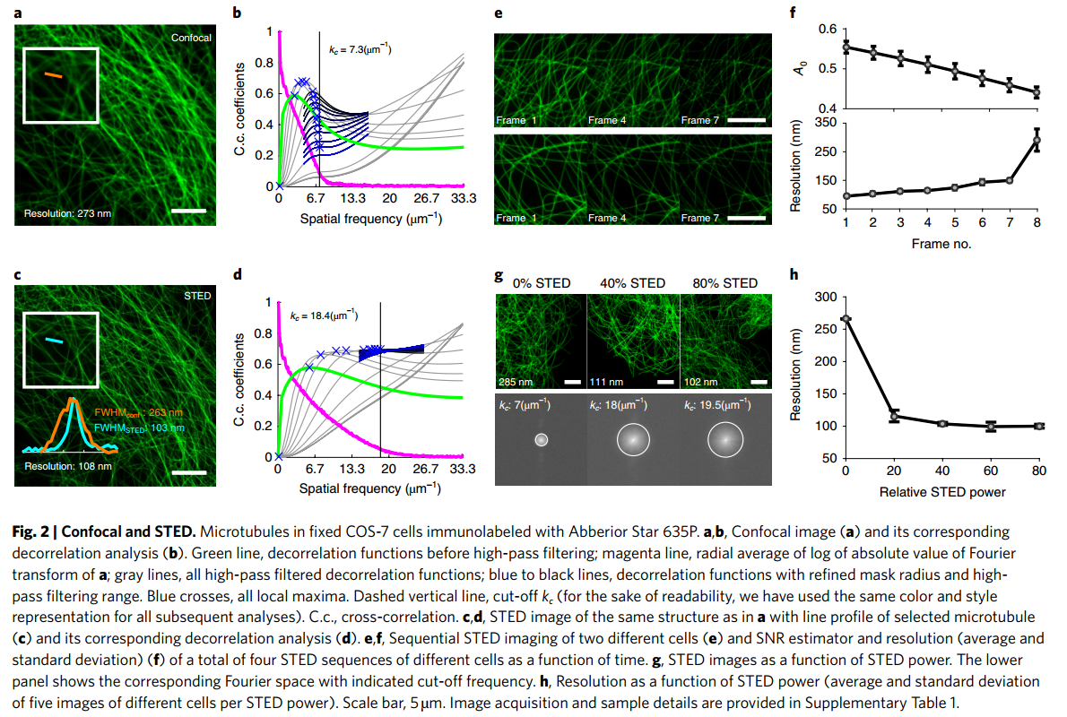 - 共聚焦和STED。用Abberior Star 635P免疫标记固定COS-7细胞中的微管。a,b,共聚焦图像(a)及其去相关分析(b)。绿线,高通滤波前的去相关函数;洋红色线,a的傅里叶变换绝对值的对数径向平均值;灰线表示所有高通滤波去相关函数;蓝色到黑色的线,去相关函数与细化掩模半径和高通滤波范围。蓝色叉,都是局部最大值。虚线竖线,截断kc(为了可读性,我们在所有后续分析中使用了相同的颜色和样式表示)。运费到付,互相关。c,d,与选定微管的线轮廓相同结构的STED图像(c)及其相应的去相关分析(d)。e,f,两个不同细胞的连续STED图像(e)和四个不同细胞的共四个STED序列的信噪比估计和分辨率(平均值和标准差)(f)随时间的函数。g, STED图像作为STED功率的函数。下面板显示了相应的傅立叶空间与指示的截止频率。h,分辨率作为STED功率的函数(每个STED功率下不同细胞的五幅图像的平均值和标准差)。比例尺,5µm。图像采集和样本细节见补充表1。
