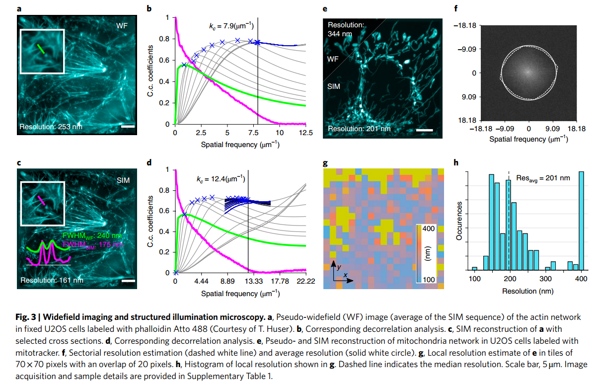 - 广角成像和结构照明显微镜。a, phalloidin Atto 488标记的固定U2OS细胞中肌动蛋白网络的伪宽视场(WF)图像(SIM序列的平均值)(由T. Huser提供)。b、相应的去相关分析。c,选取截面对a进行SIM重构。d,相应的去相关分析。e,用mitotracker标记的U2OS细胞线粒体网络的Pseudo-和SIM重建。f,扇区分辨率估计(白色虚线)和平均分辨率(白色实心圆)。g,在70 × 70像素重叠20像素的贴图中估计e的局部分辨率。h,局部分辨率直方图如图g所示,虚线为中位数分辨率。比例尺,5µm。图像采集和样本细节见补充表1。