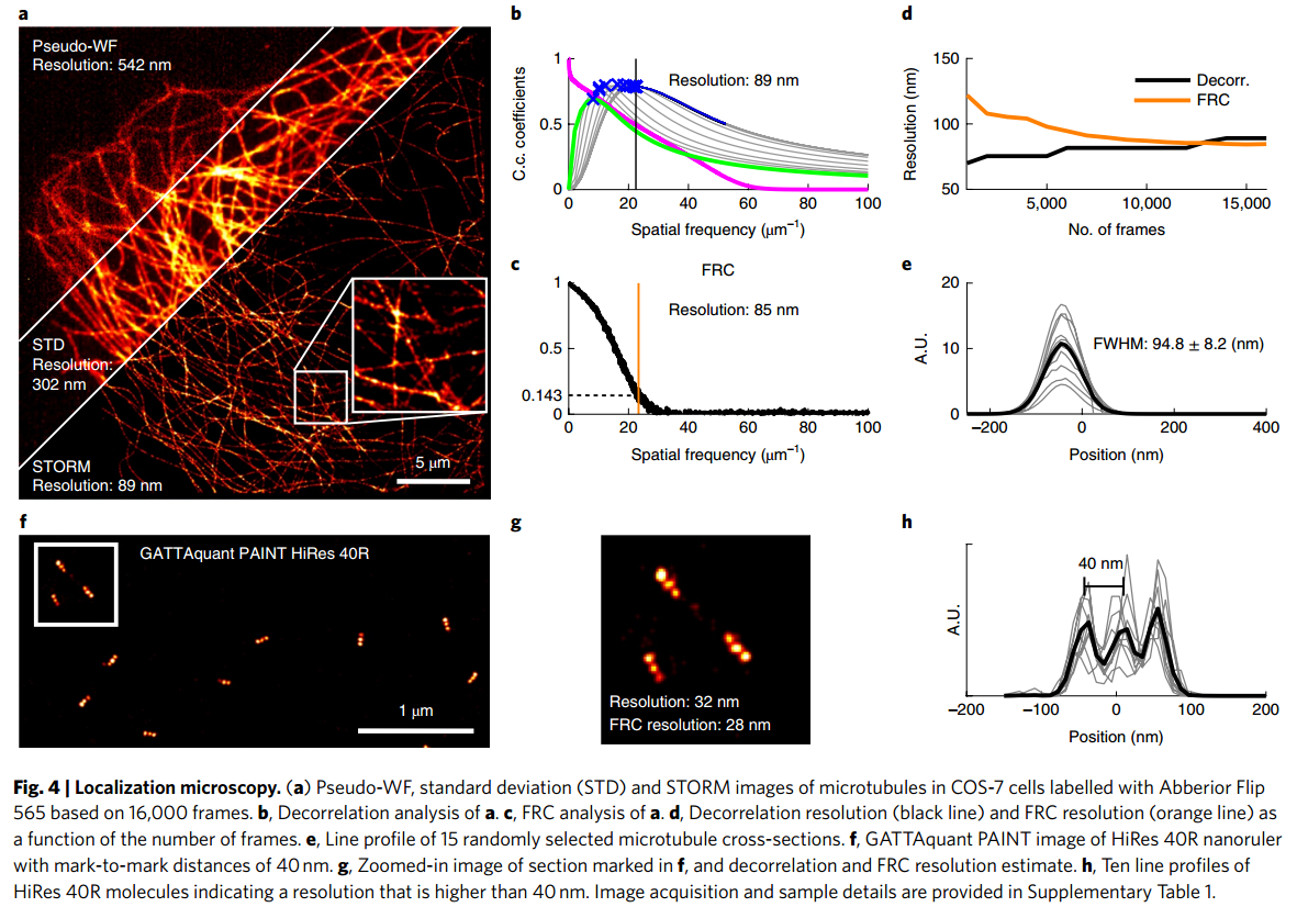 - (a)基于16000帧,Abberior Flip 565标记的COS-7细胞微管的伪wf、标准偏差(STD)和STORM图像。b, a.c的去相关分析,a.d的FRC分析,去相关分辨率(黑线)和FRC分辨率(橙线)作为帧数的函数。e,随机选取15个微管截面的线轮廓。f,标记距离为40nm的HiRes 40R纳米直尺的GATTAquant PAINT图像。g,标记为f的截面的放大图像,以及去相关和FRC分辨率估计。h, HiRes 40R分子的十行谱图,分辨率高于40 nm。图像采集和样本细节见补充表1。