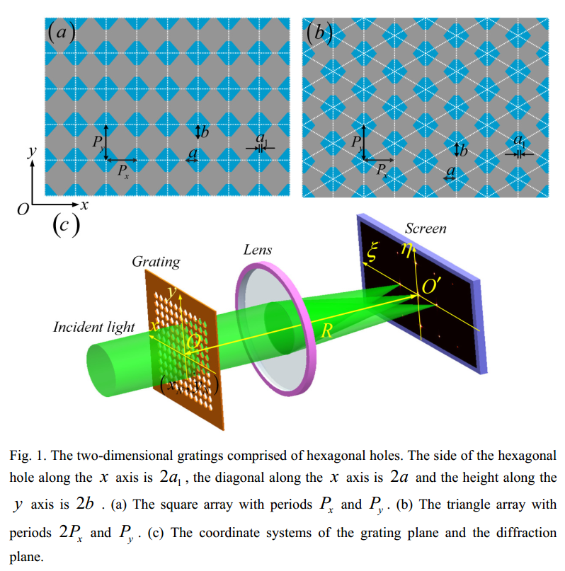 - 二维光栅由六边形孔组成。六边形孔沿x轴的边沿着为2a1,沿x轴的对角线沿着为2a,沿y轴的高度沿着为2b。(a)周期为Px和Py的正方形阵列。(B)周期为2Px和Py的三角形阵列。(c)光栅平面和衍射平面的坐标系。