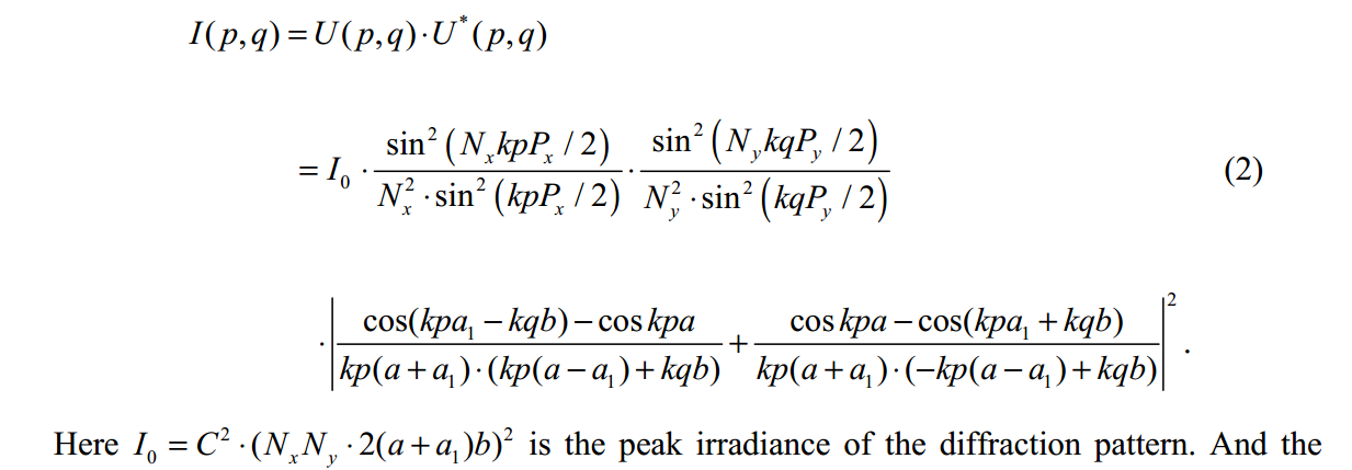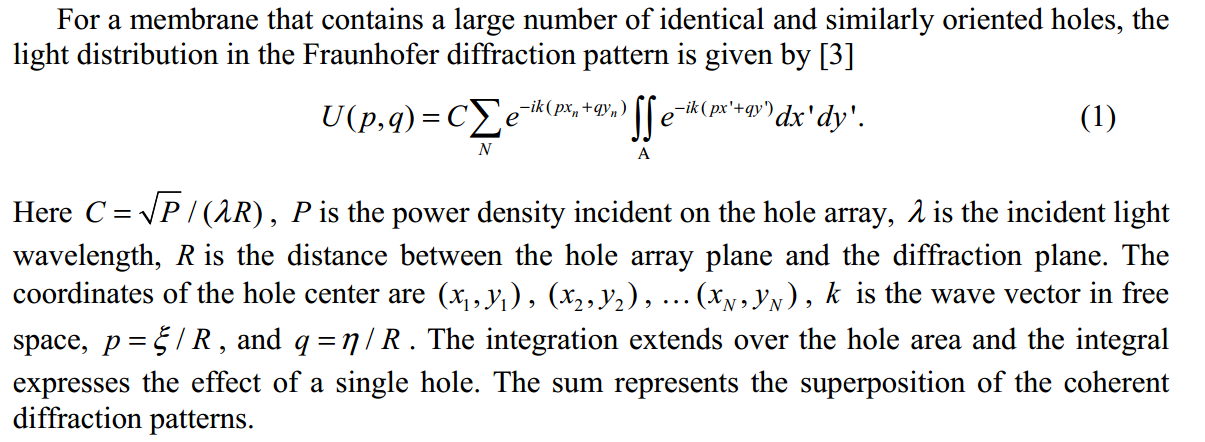 对于包含大量相同且类似取向的孔的膜,夫琅和费衍射图案中的光分布由下式给出: