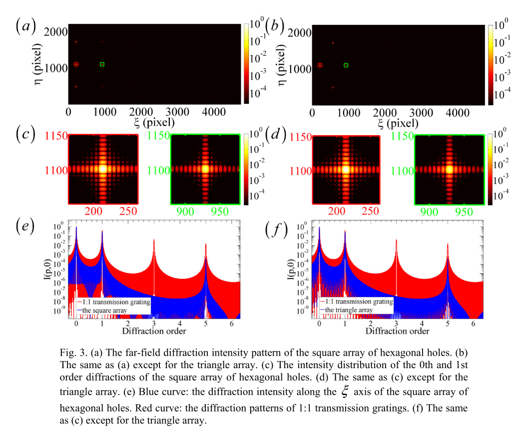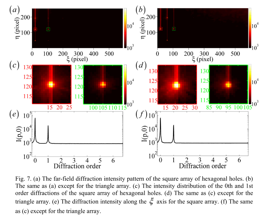 - (b)与(a)相同,除了三角形数组。(c)正方形六角形孔阵列的0级和1级衍射的强度分布。(d)与(c)相同,除了三角形数组。(e)正方形阵列沿光轴沿着的衍射强度。(f)与(c)相同,除了三角形数组。