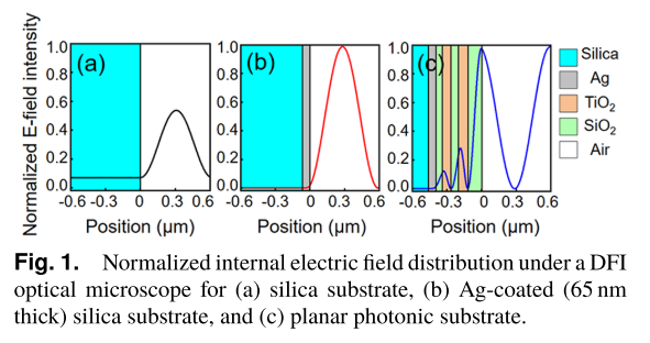1. 在DFI光学显微镜下对于(a)二氧化硅衬底、(B)Ag涂覆的(65 nm厚)二氧化硅衬底和(c)平面光子衬底的归一化内部电场分布。