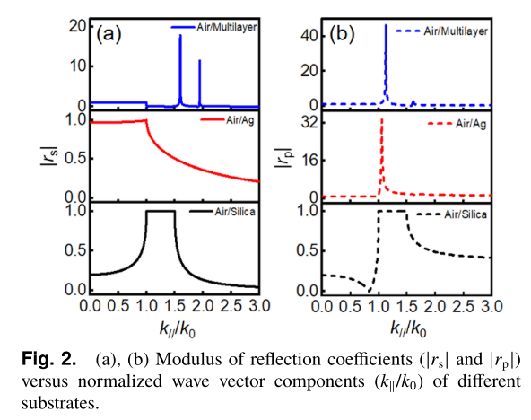 2. 图2(a)和图2(B)分别绘制了s波和p波在空气/二氧化硅(黑线)、空气/Ag(红线)和空气/多层膜(蓝线)界面处的反射系数模量与波矢量的归一化分量(k/k 0)的关系。这里,反射系数的模是反射强度与入射强度的比率。如果它大于1(在k/k 0 ≥ 1时),则表明倏逝波可以在界面处被放大,并且它们可以由纳米颗粒的散射光产生[20](更多详细信息请参见补充1)。