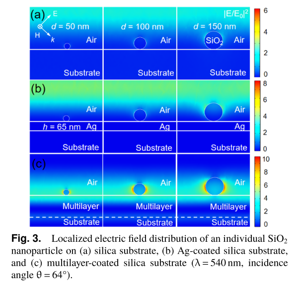 1. 单个SiO2纳米颗粒在(a)二氧化硅基底、(B)Ag涂覆的二氧化硅基底和(c)多层涂覆的二氧化硅基底上的局部电场分布(λ=540 nm,入射角θ=64°)。