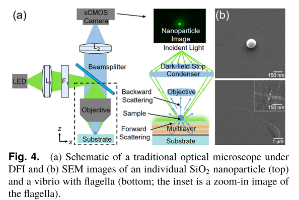 1. (a)在DFI下的传统光学显微镜的示意图和(B)单个SiO2纳米颗粒(顶部)和具有鞭毛的弧菌(底部;插图是鞭毛的放大图像)的SEM图像。