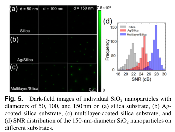 1. 在(a)二氧化硅基底、(B)Ag涂覆的二氧化硅基底、(c)多层涂覆的二氧化硅基底上的直径为50、100和150 nm的单个SiO2纳米颗粒的暗场图像,以及(d)不同基底上的150 nm直径SiO2纳米颗粒的SNR分布。
