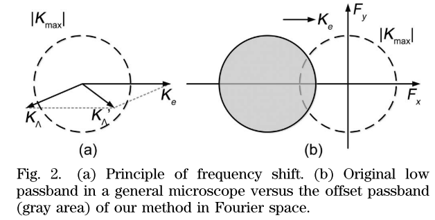 - (a)频移原理。(b)普通显微镜中的原始低通带与傅立叶空间中我们的方法的偏移通带(灰色区域)。
