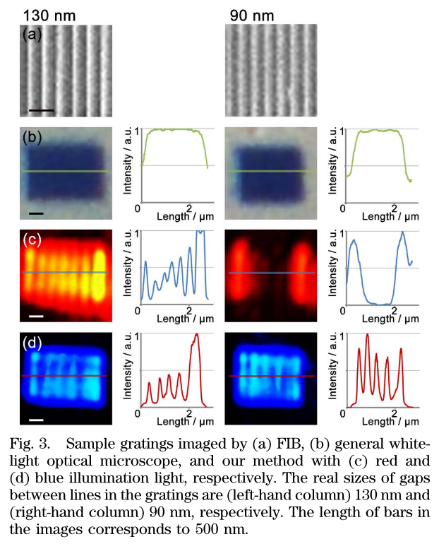 - 分别用(a)FI B、(B)普通白光光学显微镜和我们的方法用(c)红色和(d)蓝色照明光成像的样品光栅。光栅中的线之间的间隙的真实的尺寸分别为(左栏)130 nm和(右栏)90 nm。图像中的条的长度对应于500 nm。