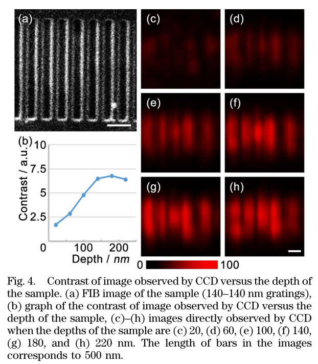 - CCD观察到的图像对比度与样品深度的关系。(a)图B为样品(140-140 nm光栅)的图像,(B)由CCD观察到的图像对比度相对于样品深度的曲线图,(c)-(h)当样品深度为(c)20、(d)60、(e)100、(f)140、(g)180和(h)220 nm时由CCD直接观察到的图像。图像中的条的长度对应于500 nm。
