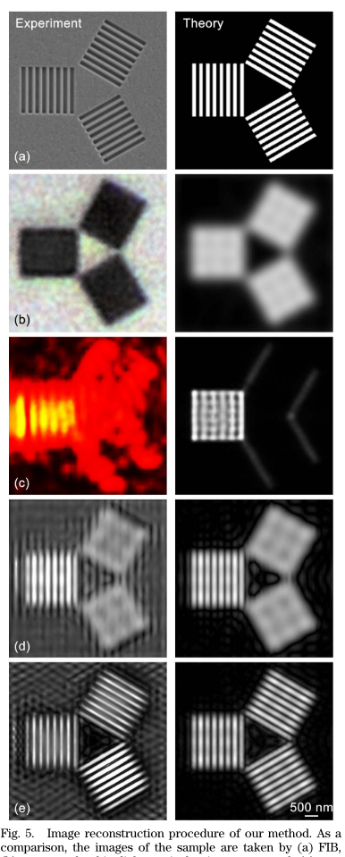 - 我们的方法的图像重建过程。作为比较,通过(a)FIB、(B)普通白光光学显微镜和(c)具有固定照明方向的我们的方法来拍摄样品的图像。(d)如果考虑一个单个帧,则只能部分地重建图像。另一方面,如果计算更多(三个)帧的图像,则可以预期更好的结果。左列中的图像都是从实验中生成的,而右列示出了模拟结果。